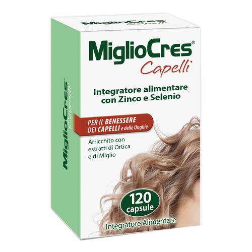 MiglioCres CapelliDescrizione Integratore alimentare con miglio e ortica, che favoriscono il benessere di unghie e capelli. Zinco, vitamina E, vitamina C, rame e selenio contribuiscono alla protezione delle cellule dallo stress ossidativo. Zinco e selenio contribuiscono al mantenimento dei capelli sani. Il rame contribuisce alla normale pigmentazione dei capelli. Metionina e cistina sono aminoacidi solforati che entrano nella composizione cheratina, sostanza base della struttura dei capelli. Ingredienti Gelatina alimentare; agente di resistenza: glicerolo (E422); miglio estratto oleoso da frutto in olio di germe di grano (...