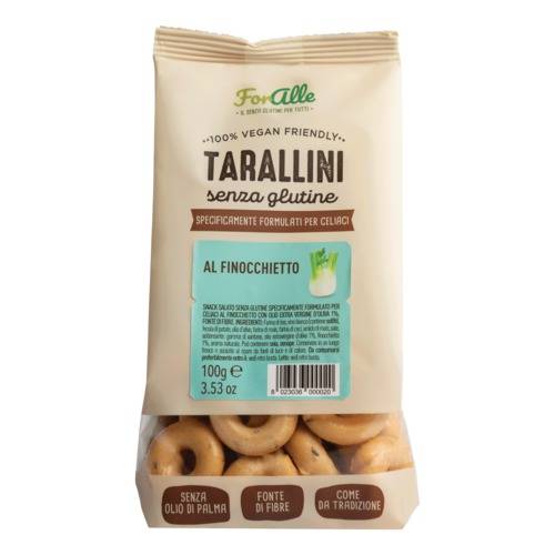 ForAlleGLI SNACK SENZA GLUTINE PER TUTTI TARALLINI al Finocchietto Descrizione Snack salato senza glutine specificamente formulato per celiaci al finocchietto con olio extravergine d'oliva 1%. Ingredienti Farina di riso, vino bianco (contiene solfiti), fecola di patate, olio d'oliva, farina di mais, farina di ceci, amido di mais, sale; addensante: gomma di xantano; olio extravergine d'oliva 1%, finocchietto 1%, aroma naturale. Senza latte, senza uova e senza lievito. Caratteristiche nutrizionali Valori medi per 100 g Energia 1.818 kJ/433 kcal Grassi di cui acidi grassi saturi 14 g 2,3 g Carboidrati di cui...